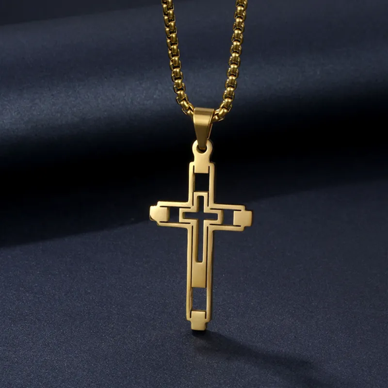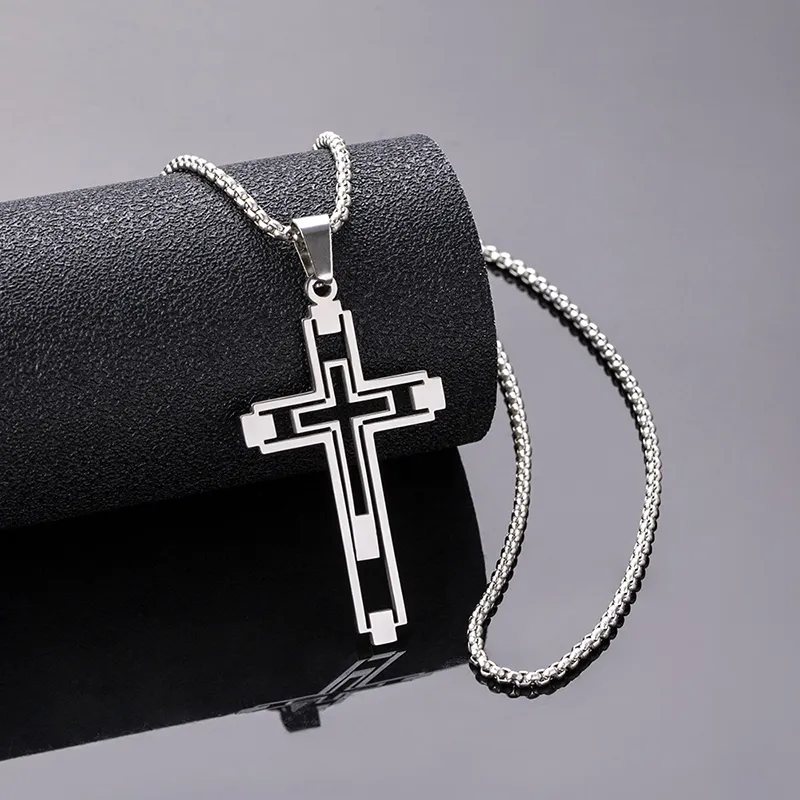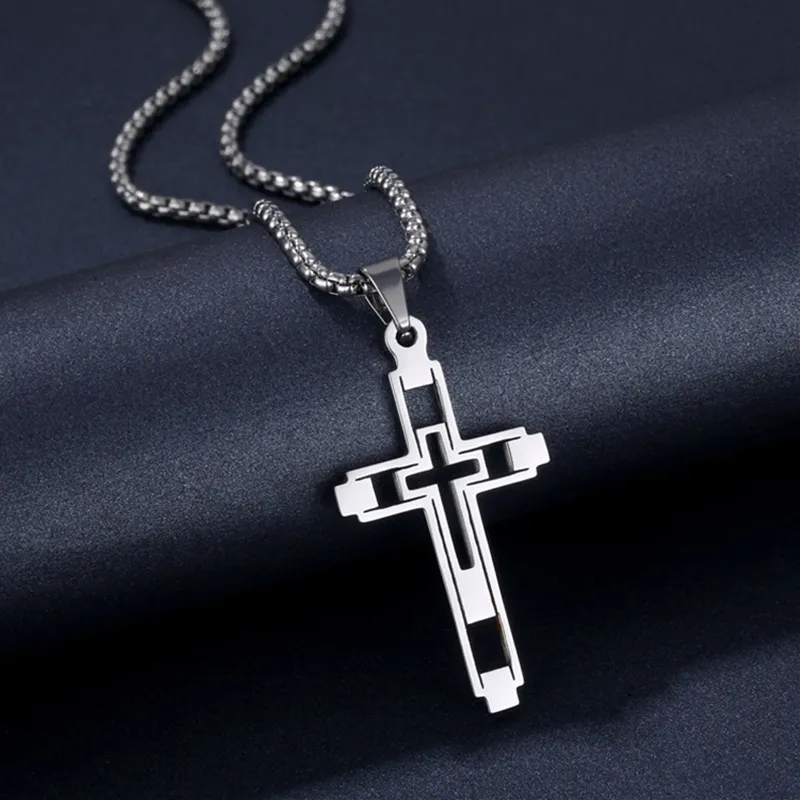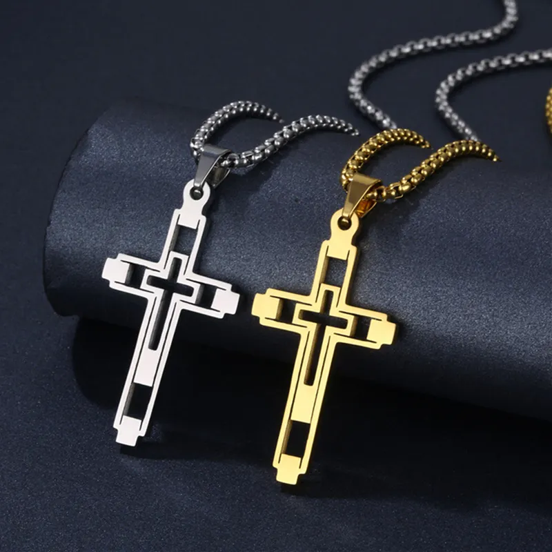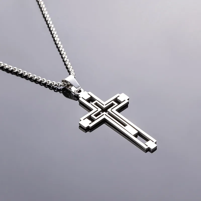 Hip Hop Titanium Steel Hollow Double Cross Pendant Necklace