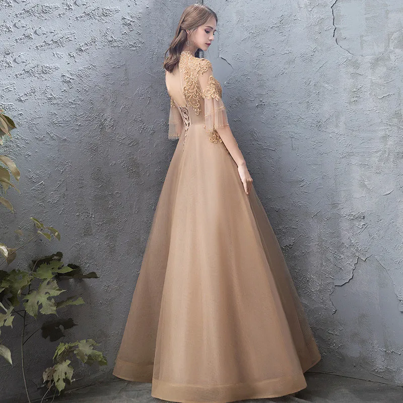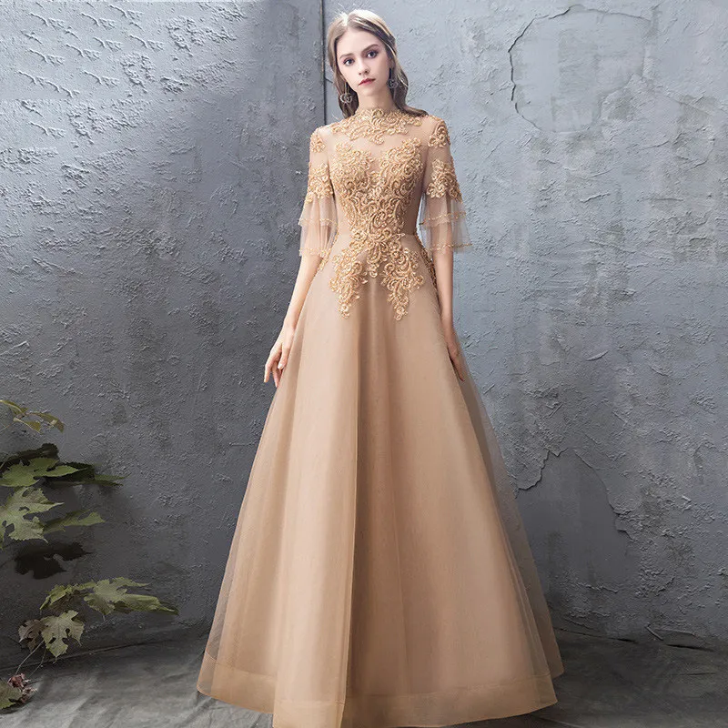 Banquet Evening Dress Female Golden Stand-up Collar Host Annual Party Dress Ski