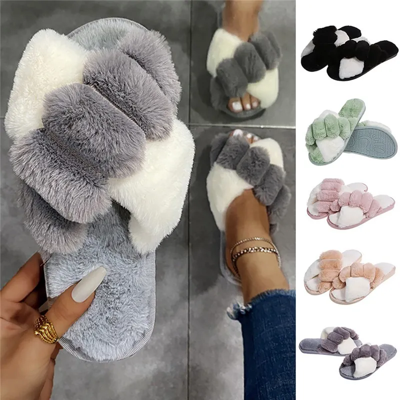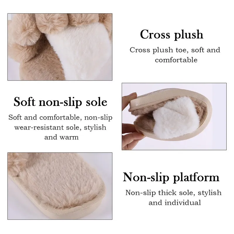 Cross-strap Furry Slippers Home Flat Indoor Floor Bedroom House Shoes Women