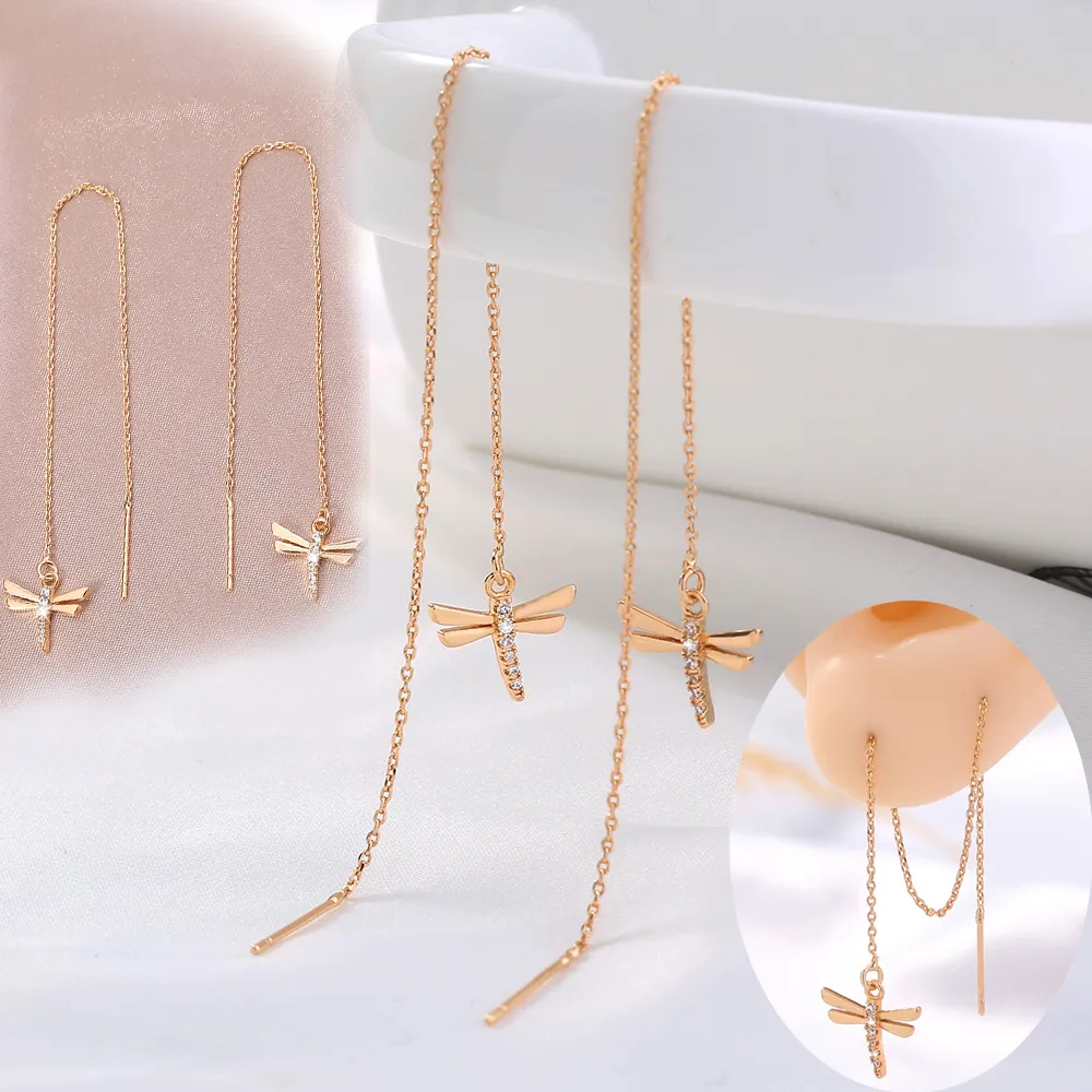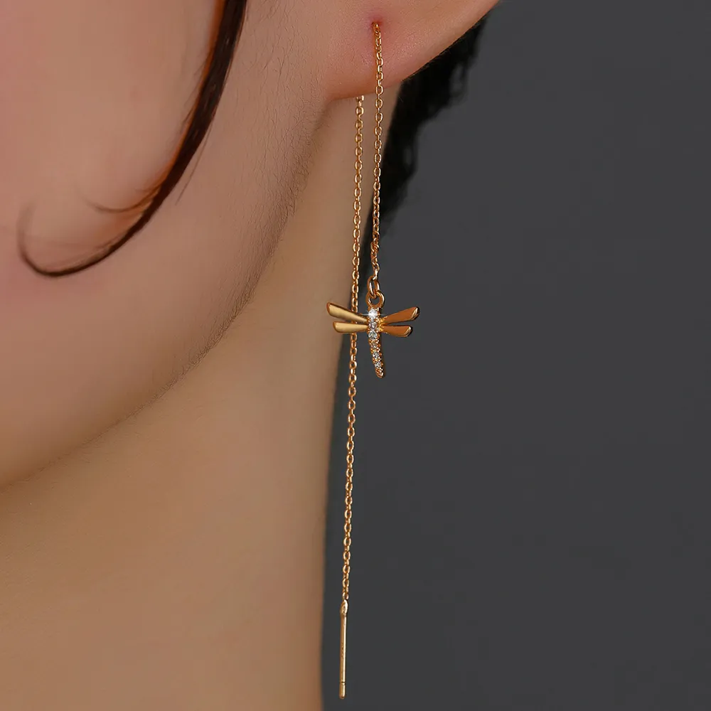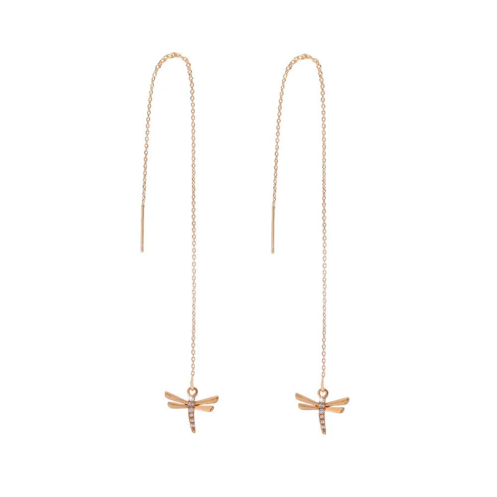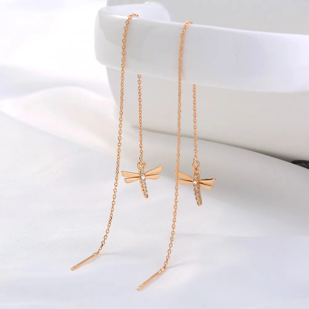 Gold Copper Dragonfly Micro-Set Zircon Long Tassel Ear Wire