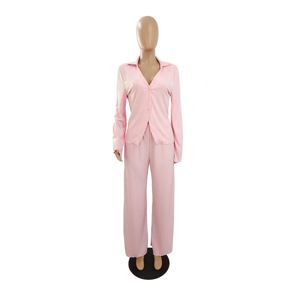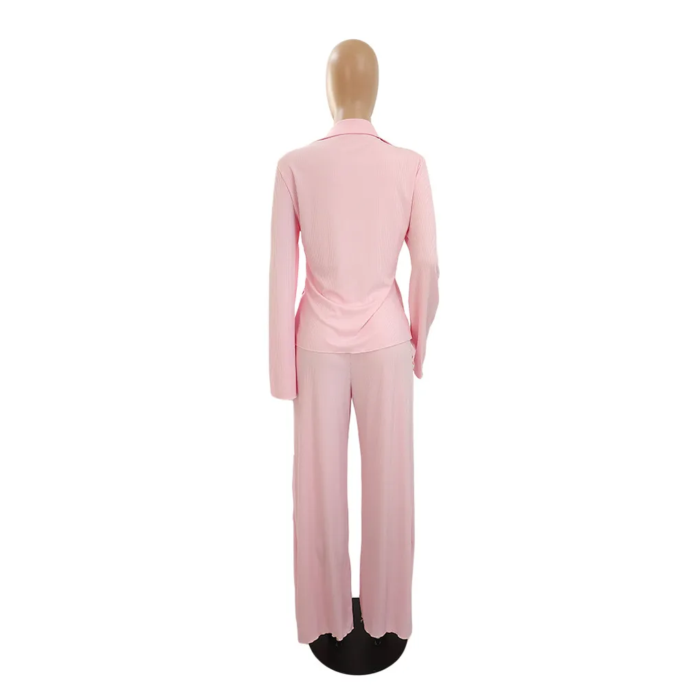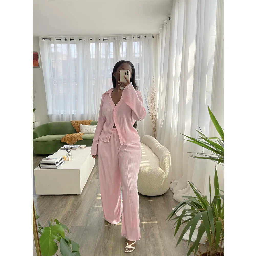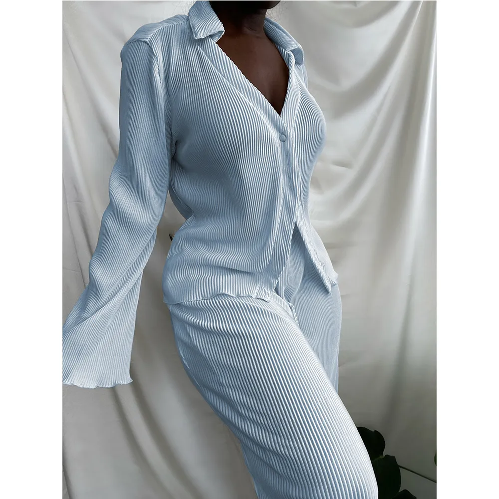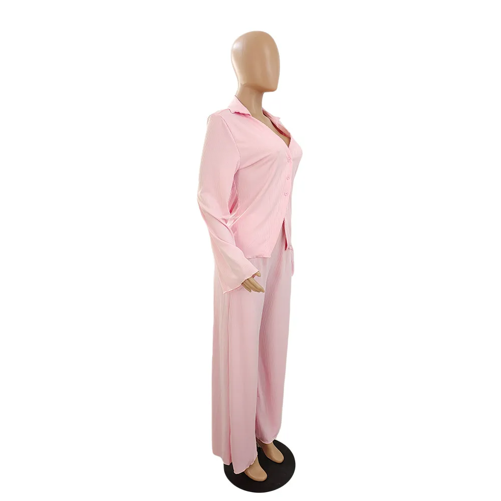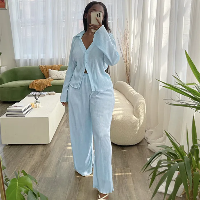 Women's Solid Color Rib Fabric Wave Edge Loose Homewear Flare Sleeve Blouse Suit