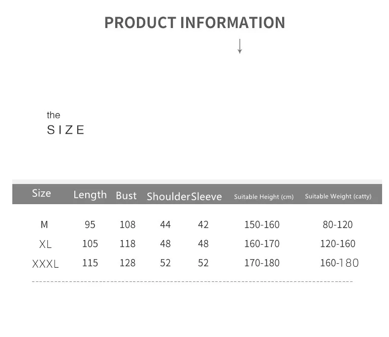 Size: M (80-100 catties), XL (120-140 catties), XXXL (160-180 catties)