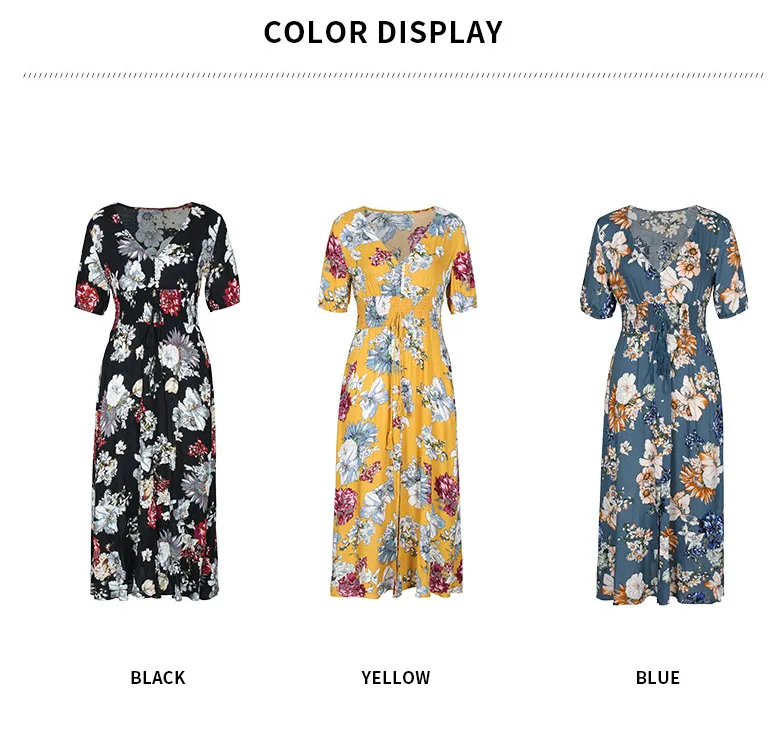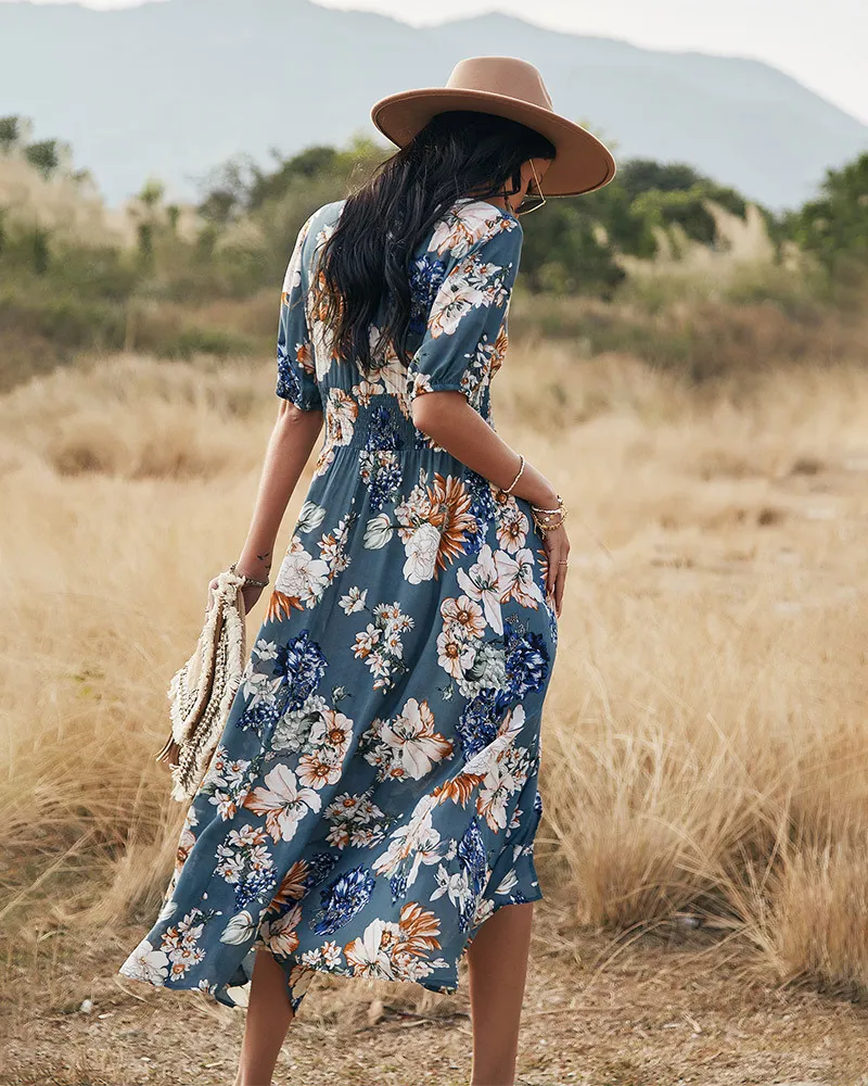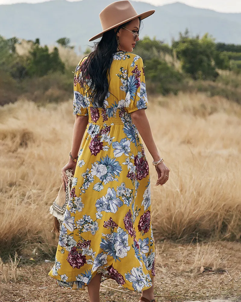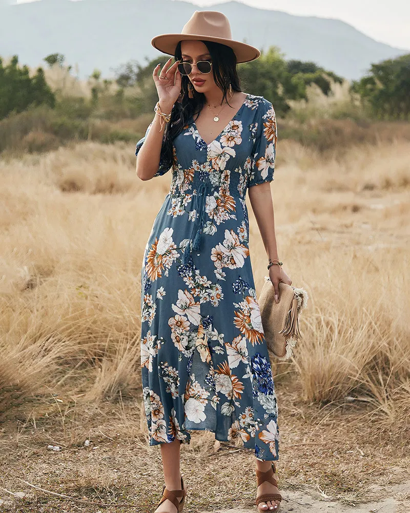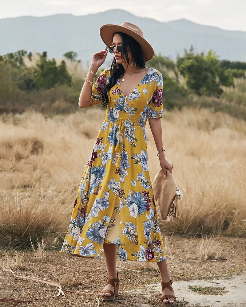 Floral Summer Beach Dress With V Neck Elastic Waist Dresses For Women